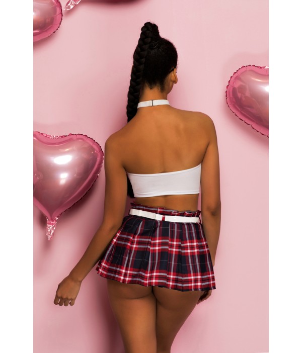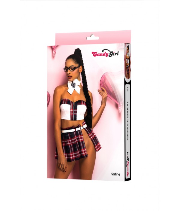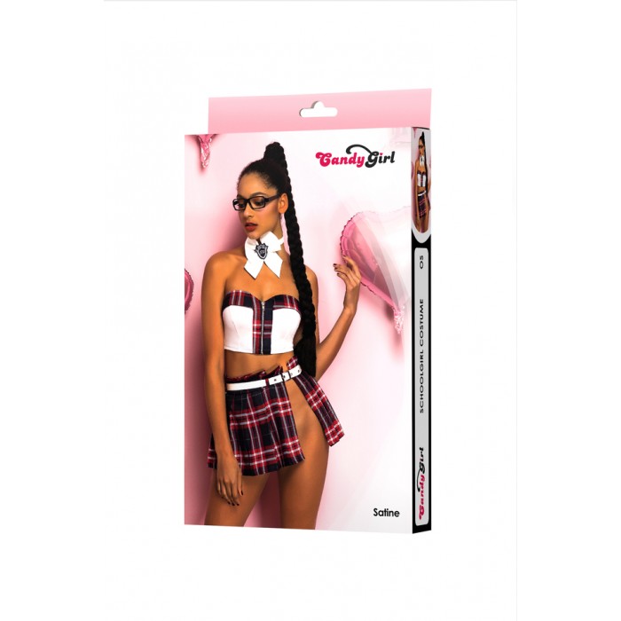 Костюм школьницы Candy Girl® Satine на вас взбудоражит внимание мужчины. Топ из эластичного трикотажа на металлической молнии подчеркивает объем груди, оставляя открытым декольте. Тканевая клетчатая юбка фиксируется с помощью лакового пояса и игриво приоткрывает нежную кожу в интимной зоне. Для строгого учителя очевидно, что под юбочкой ничего нет. Сможет ли он устоять и не быть слишком строгим к нерадивой ученице? Лаковый галстук-бабочка на эластичной резинке со значком и очки дополняют комплект. Предложите партнеру сыграть в увлекательную эротическую игру. Пусть он научит вас основам любви, а потом проверит насколько хорошо урок усвоен.