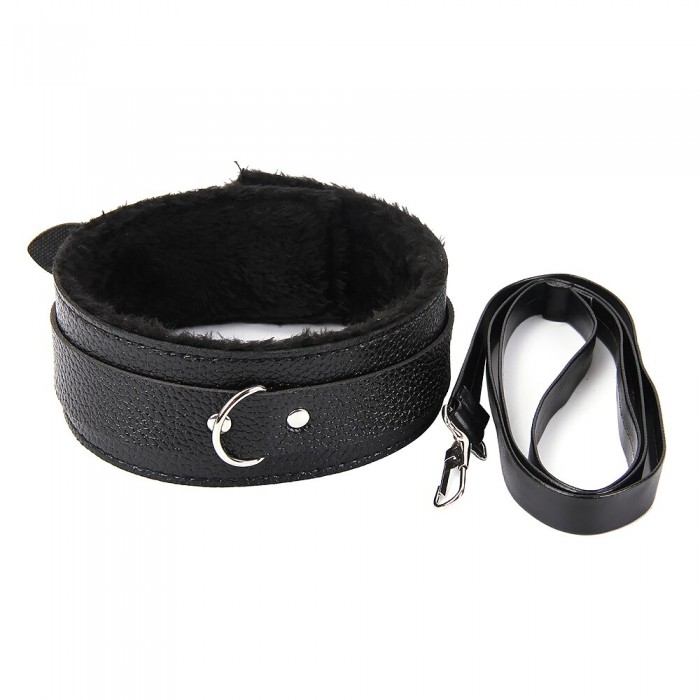 Покажите своему партнеру кто главный. Ошейник с поводком будет в этом деле просто незаменимым помощником. Стиль ему задают черный цвет и металлическая фурнитура. Крепление происходит за счет ремешка с пряжкой, а шлейка поводка закреплена карабином, который при желании можно снять.