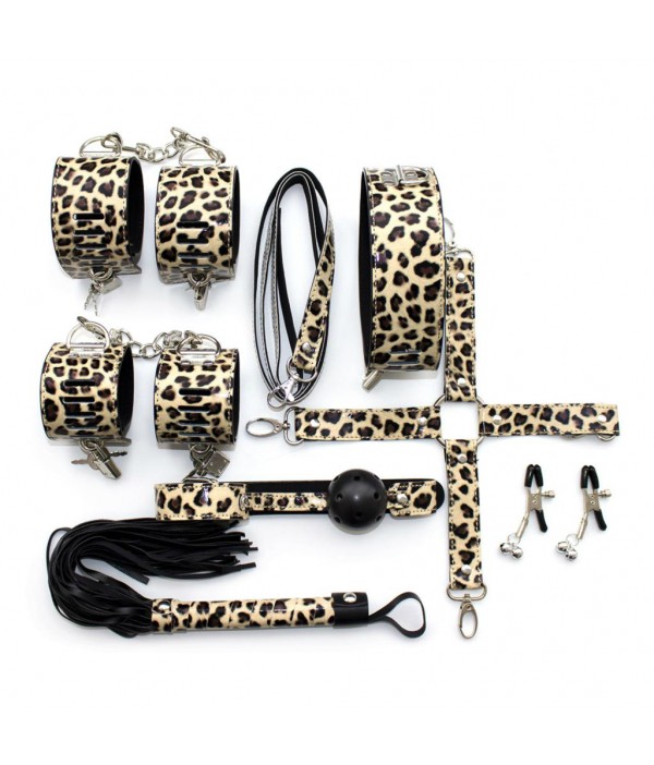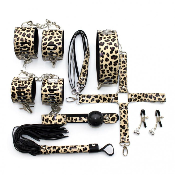 Разнообразьте Вашу близость вместе со стильным набором атрибутов BDSM. Аксессуары выполнены из PVC с лакированным покрытием с расцветкой кожи леопарда, мягки внутри для предотвращения потёртостей. В комплект входят наручники и поножи, которые можно соединить между собой с помощью сцепки, ошейник со съёмным поводком, дышащий кляп и регулируемые зажимы для сосков. Устройте Вашей половинке незабываемую ночь с пикантными сексуальными играми!