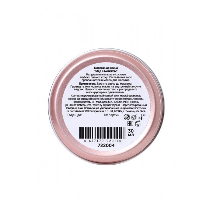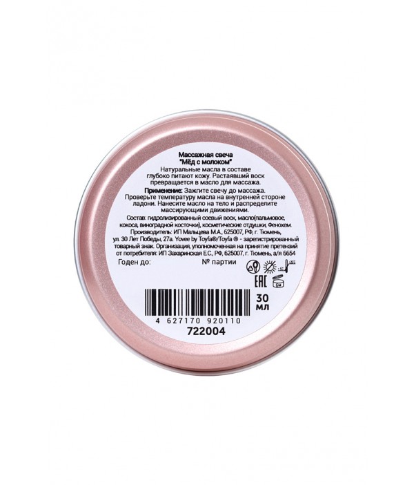 МАССАЖНАЯ СВЕЧА YOVEE BY TOYFA «МАССАЖ НЕЖНОСТИ», С АРОМАТОМ МЕДА С МОЛОКОМ, 30 МЛ, арт.722004