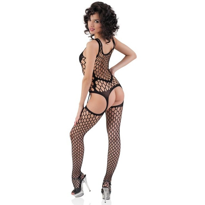 Тело в этом комбинезоне сливается во едино, открывая всю красоту и страсть! Смотрится очень эротично, при этом структура наряда сглаживает недостатки, делая фигуру максимально привлекательной! Такая модель хорошо тянется, очень комфортна и не рвется при малейшей зацепке!Более плотная вставка прикрывает груди и область живота, спускаясь тонкими подвязками и облегая ноги уже более крупной сеткой! Отделка на боках верха выполнена из такого же переплетения. Цвет черный, матовый. Искусство соблазнения требует жертв, но цена изделия доступна любому! Размер: S/L