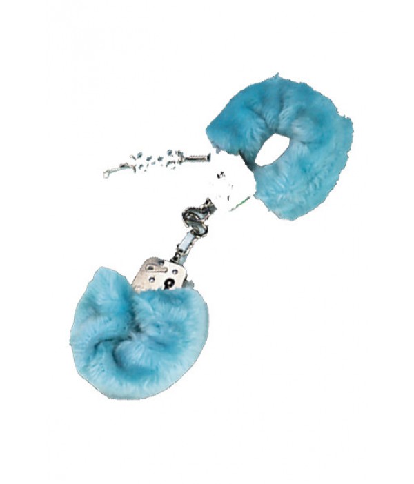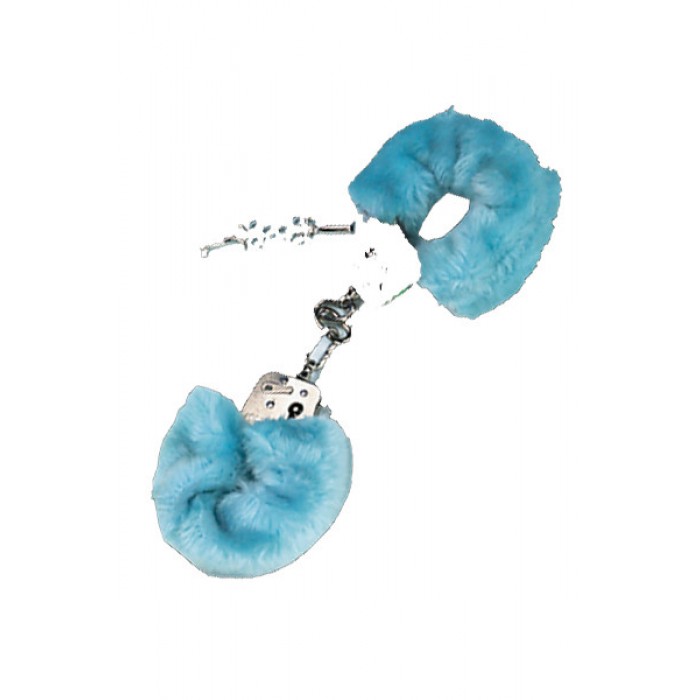 Мягкие голубые наручники на меху с металлической основой для страстных ночей.