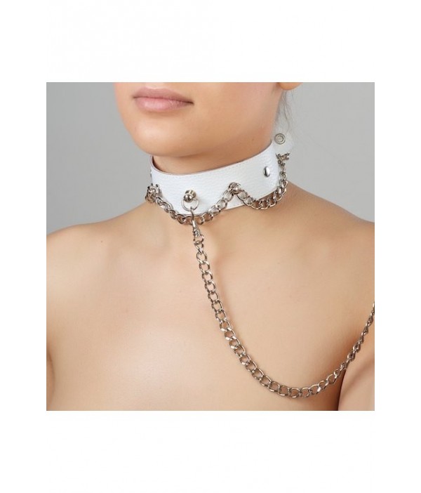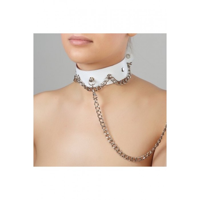Ошейник из натуральной кожи в белом цвете с украшениями и поводком-цепочкой от российского производителя товаров для взрослых Sitabella.