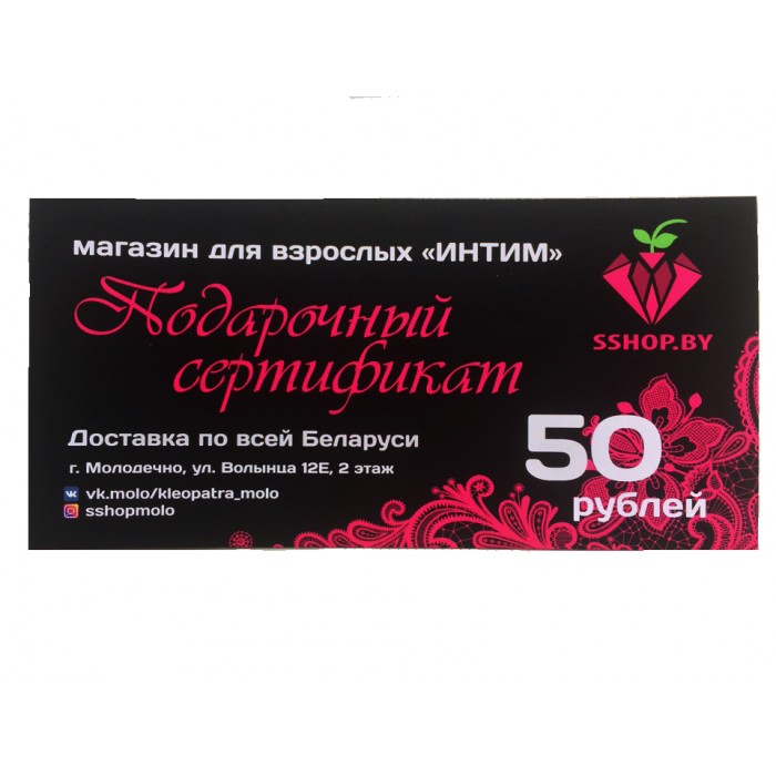Подарочный сертификат на 50 рублей от магазина интимных товаров sShop.by даёт право на приобретение любых товаров в нашем интернет-магазине.