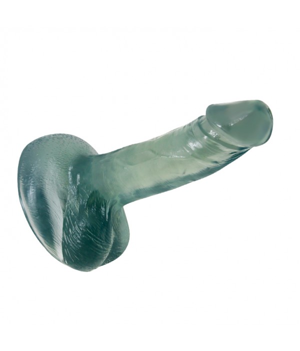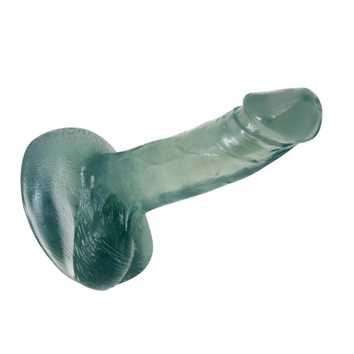 Фаллоимитатор прозрачный голубого цвета с мошонкой на присоске. Увеличенная поверхность присоски надежно прикрепит фалоимитатор на любой поверхности и даже на скользкий кафель в ванной комнате.