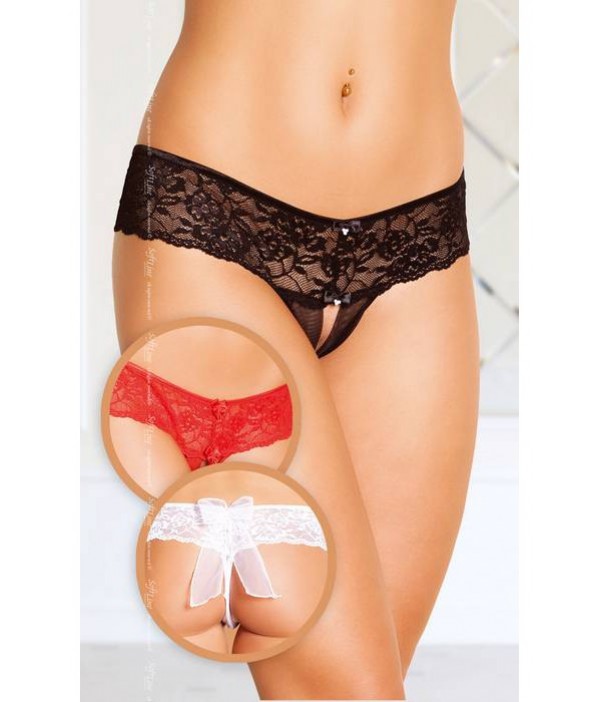 Женские эротические кружевные трусы-стринги из черного кружева с интимным разрезом и бантиком сзади.