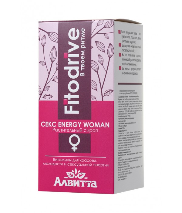 «Секс energy woman» - это источник прекрасного настроения, сексуальной энергии, раскрепощенности, эмоционального комфорта во время секса, молодости, красивого тела, роскошных волос, бархатной кожи, работоспособности. Это новые или уже забытые грани сексуальных наслаждений, неги, откровенной, дерзкой энергии безграничного, необузданного секса. Благодаря сбалансированному сочетанию целебных трав, содержащих природные женские гормоны и растений - афродизиаков пролонгировано воздействует на женщину и ее гормональную систему мягко и естественно повышая уровень тестостерона, возвращая тем самым половое влечение и увеличение либидо и эстрогена, количество которого резко сокращается в период менопаузы.