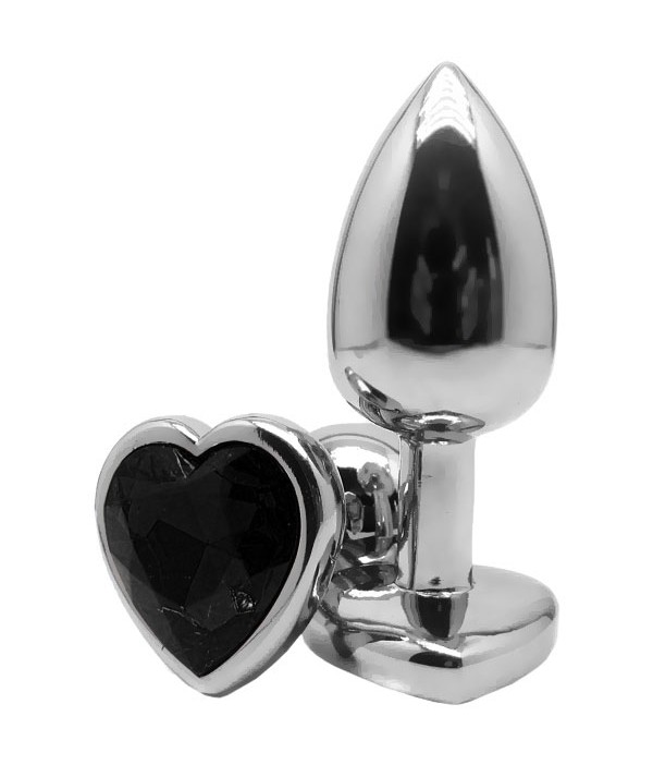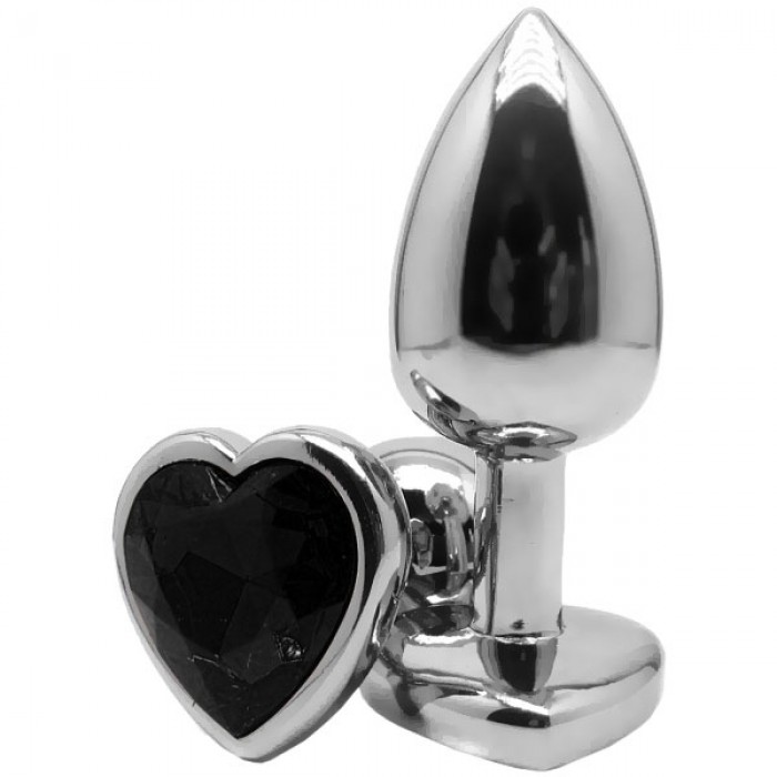 Анальная игрушка из метала с серебристым покрытием и черным кристаллом-украшением в форме сердца.